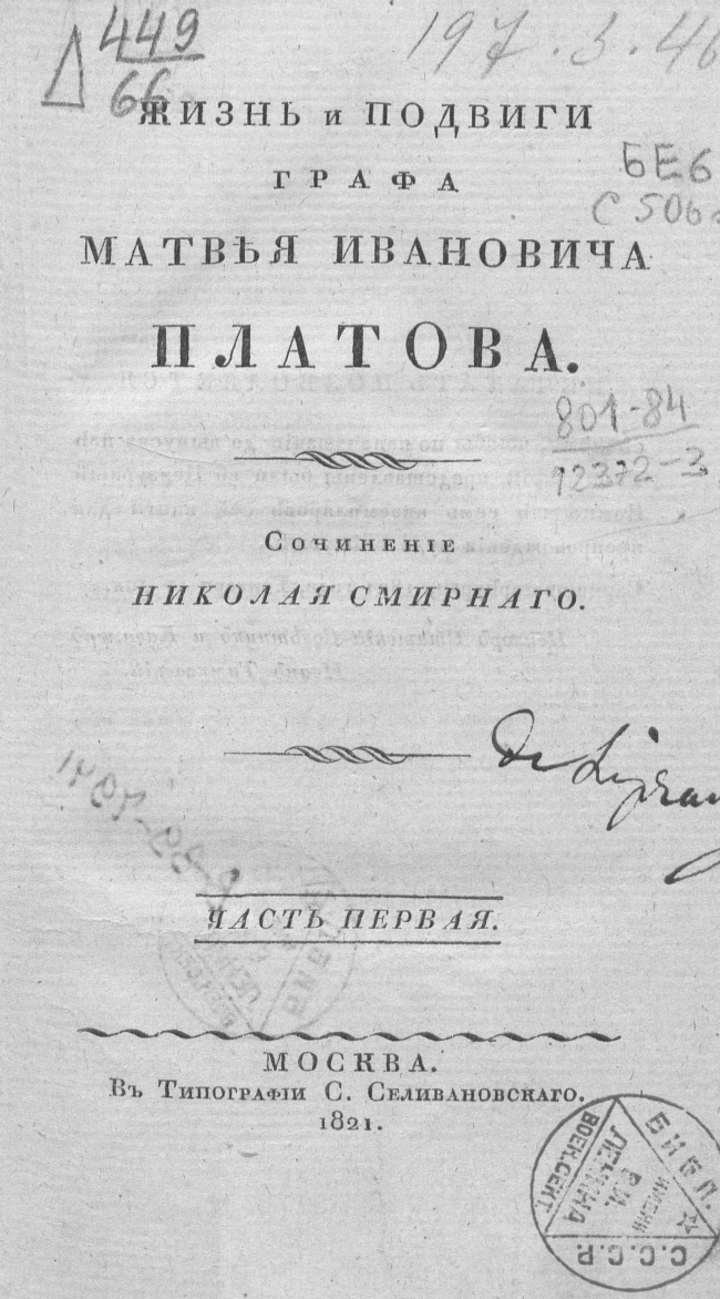 Жизнеописание знаменитого донского атамана Матвея Ивановича Платова (1753—1818). Во время Отечественной войны 1812 г. Платов командовал всеми казачьими войсками на границе, прикрывал отступление русской армии, а затем преследовал остатки французской армии, нанося ей немалый урон. Казаки Платова участвовали в заграничных походах, а после заключения мира Матвей Иванович сопровождал императора Александра в Лондон. Труд Н. Ф. Смирного, адъютанта Платова, раскрывает прежде всего характер казачьего атамана. Первая часть трехтомного сочинения охватывает период с юности Платова до славного окончания 1812 г. |