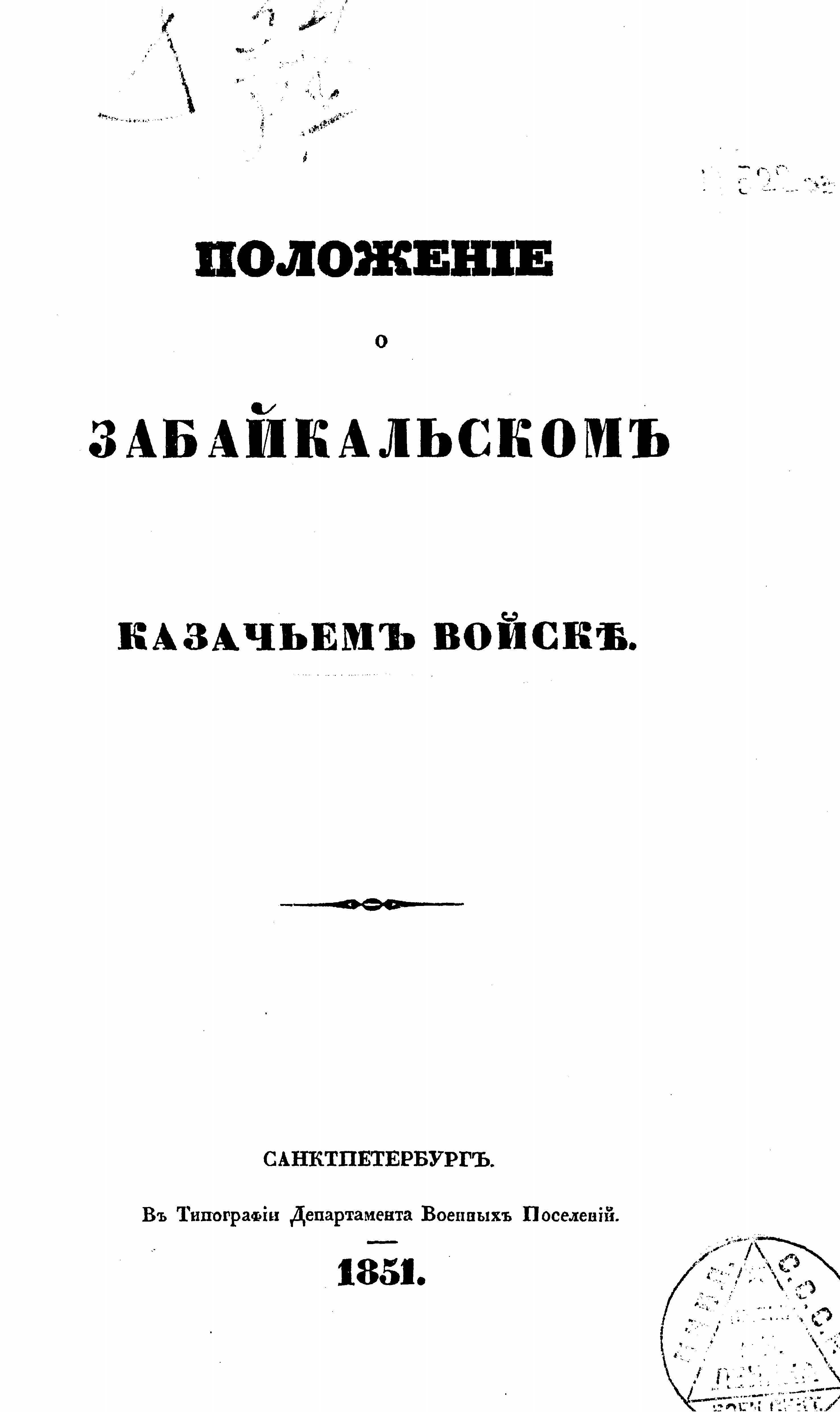 Название: Положение о Забайкальском Казачьем Войске Издательство, год издания: Санкт-Петербург, Тип. Департамента Военных Поселений, 1851 Формат: PDF Качество: отсканированные страницы Количество страниц: 96